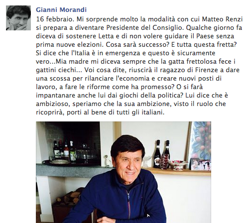 Nel post di ieri ho idealmente posto tre domande a Renzi che sono alla base della mia preoccupazione di questi giorni. Per inciso un anziano come me, Gianni Morandi, nutre le mie stesse preoccupazioni.