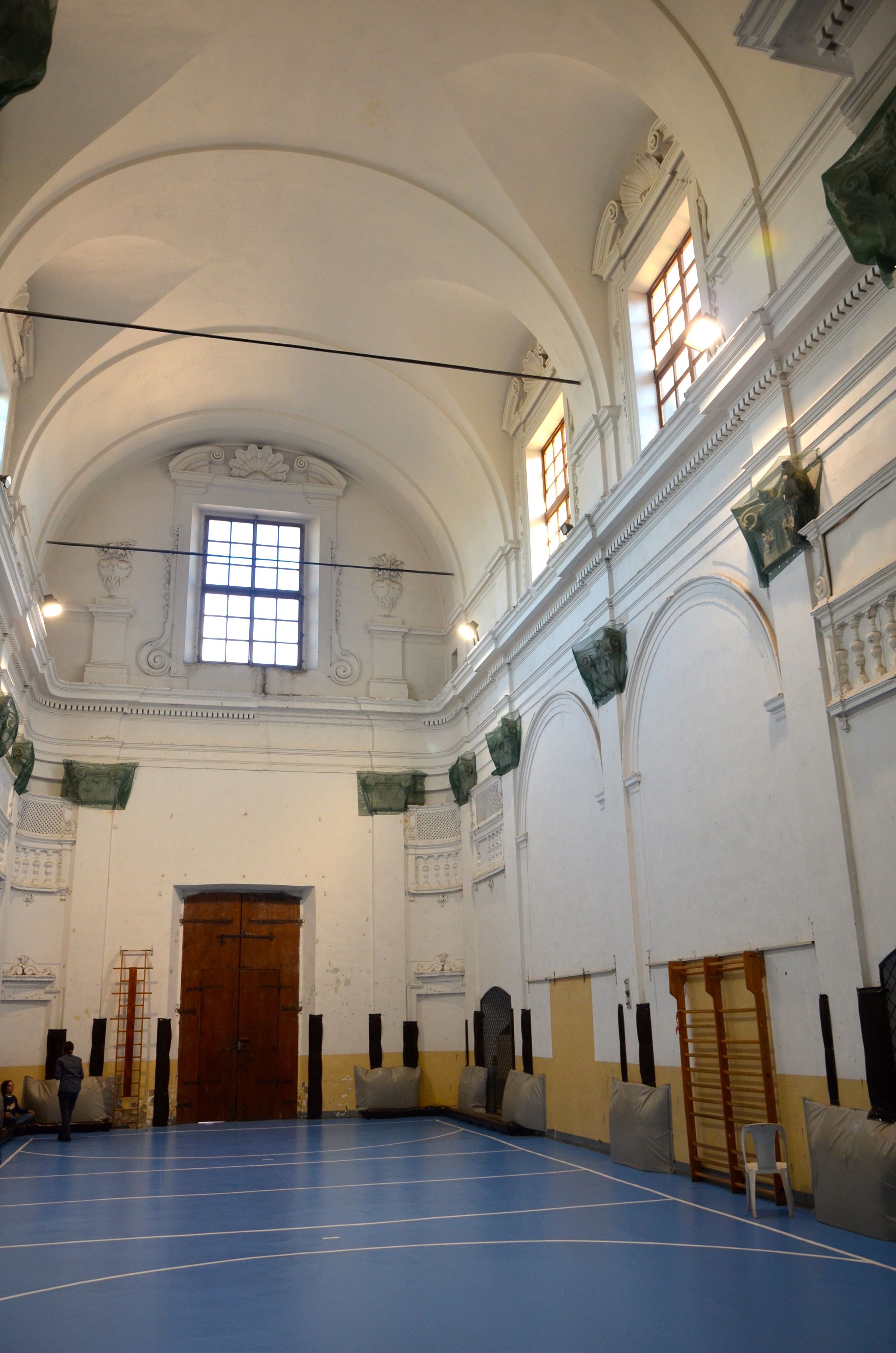 La mattina dopo Giovanna non ci lascia partire all’alba ma ci ’trascina’ in un’altra scuola della rete a Castiglion Fiorentino, un altro set del film. Una giovane preside ci accoglie, ci accompagna nel centro della cittadina e poi nella scuola ospitata in un antico edificio degli scolopi perfettamente restaurato per fungere da scuola moderna. Mentre ci accompagna in ascensore sulla sommità della scuola per ammirare da vicino la torre della città e i tetti ci preannuncia la sorpresa dell’antica cappella anch’essa destinata alla scuola. Non potevamo immaginare che la scuola avesse una palestra simile. Nel film tanta bellezza e tanta ricchezza ci era stata annunciata. Intanto Giovanna riprendeva di gran lena il suo lavoro perché dopo la prima incomincia una nuova avventura.