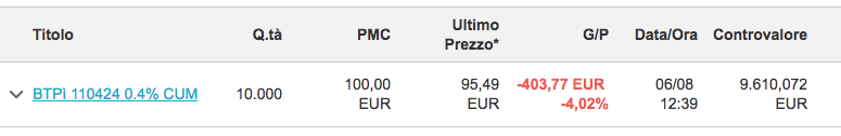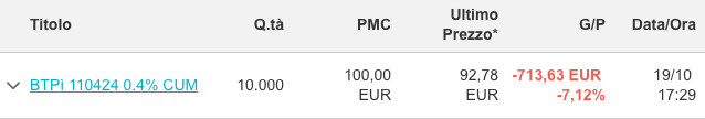 Di ogni investimento quantifica la differenza tra quanto si è investito e quanto vale il titolo in quel momento. Un BTP estremamente stabile sinora, un BTP Italia che oltre a una cedola fissa riconosce la eventuale perdita di valore qualora ci fosse un deprezzamento per l’inflazione, sempre visto da me come un salvadanaio sicuro ora esponeva la seguente situazione: