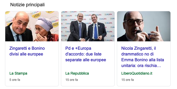 Cercavo conferma della posizione di Zingaretti sulla proposta del listone unico europeista antisovranisti proposto da Calenda ed ho trovato sulla pagina di Google questa sinossi di tre titoli sulla stessa notizia.