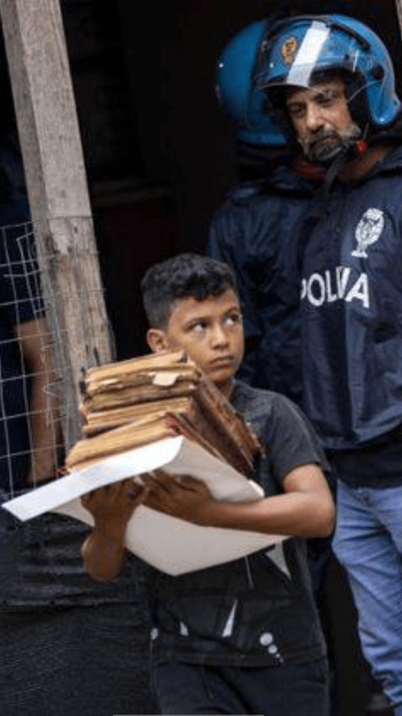 - lo sguardo fiero del giovanetto che viene evacuato dalla polizia e che in mano porta dei libri,