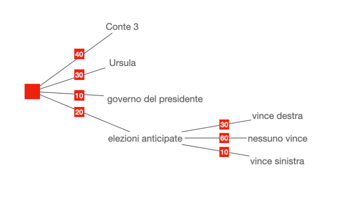 Assumendo che Conte aggreghi in eventuali elezioni anticipate una componente centrista dei 5 stelle e che non vinca nessuno egli sarebbe ancora in campo nella formazione di un nuovo governo di coalizione. Sommando le probabilità dei possibili eventi avrebbe probabilità 82% di essere ancora sulla scena tra tre o quattro mesi, Salvini potrebbe essere presidente del consiglio con probabilità 6%, assumendo che le mie ripartizioni di probabilità fossero attendibili.
