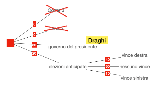 In questi giorni di discussioni e di dirette televisive la percezione della gravità del momento si è affievolita, tutto fa pensare che sia questione di pochi mesi, il vaccino, i finanziamenti europei, la concordia dei politici, tutto promette il ritorno alla normalità e che le elezioni anticipate in fondo siano solo un problema organizzativo e di protocolli .. e le fanno tutti perché noi no? Così i mal di pancia potrebbero tradursi in decisioni avventate in sfide temerarie all’ultimo sangue, o la va o la spacca. E’ la posizione di molti grillini, anche di alcuni politici di sinistra, della stessa Meloni, di partitini di centro che non vedono l’ora di menar le mani. Per questo io continuo a valutare al 20% la probabilità di un fallimento del tentativo Draghi e di nuove elezioni.
