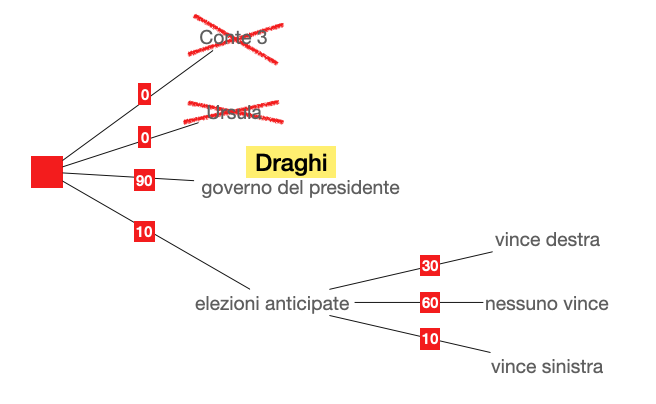 Ma l’incertezza è legata anche alla varietà delle posizioni emerse molte delle quali erano tutt’altro che trasparenti e coerenti. La stessa adesione entusiastica di Salvini mi è sembrata esagerata: forse per giustificare il repentino giro di valzer agli occhi dei propri elettori tradizionali ma anche per avere buoni argomenti pronti in una eventuale imminente campagna elettorale. Tutti, chi più chi meno, in ogni caso, non escludono che tra gli esiti possibili ci sia il fallimento del tentativo che come vedete nella figura io do ancora al 10%. Questa tensione pre elettorale è percepibile anche nelle diffidenze reciproche: lungi dal concertare soluzioni comuni in una situazione di emergenza come è quella attuale, ciascuna forza politica si arrocca sulle sue posizioni e ne esplicita le diversità dagli altri come se si dovessero marcare future scuse per rompere l’alleanza che si vuole costituire. Se le forze politiche sapessero parlare e confrontarsi cercando soluzioni ai nostri problemi non sarebbe stato necessario scomodare un signore che si accingeva a godere tranquillamente una meritata pensione.