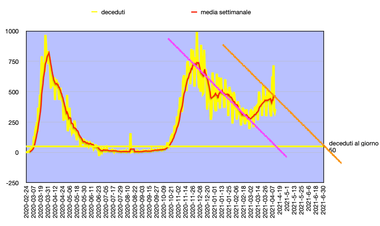 La soglia non è nota, non se ne parla ma si capisce che lo standard potrà essere quello assunto dagli inglesi, una cinquantina di casi al giorno per almeno una settimana. In altri post ho rivendicato l’importanza di formulare previsioni statistiche, non predizioni o profezie ma previsioni. Questa mattina mi sono messo a lavorare e riflettere su questo grafico riguardante i decessi per COVID registrati sin dall’inizio. La curva gialla rappresenta i deceduti giornalieri mentre quella rossa rappresenta la media mobile settimanale. Le rette colorate in viola ed arancione sono miei ragionamenti molto semplicistici con la solita matematica della serva.