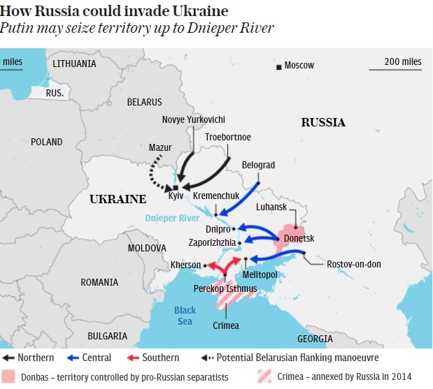 L’articolo di Lerner è complesso e di non facile lettura, segnato dalla esperienza dolorosa della sua famiglia. Non condivido però la tesi secondo cui Putin si sia mosso perché la Nato si è ritirata dall’Afganistan. Lo ha fatto in questo momento anche per ragioni interne, è il segno di una debolezza politica di una leadership che non può consolidarsi nel tempo se non dà frutti tangibili a livello della qualità della vita del popolo e ha bisogno di vittorie sul campo. Se fosse vera la mia ipotesi, la situazione sarebbe ancora più preoccupante perché tante debolezze Biden da un alto con le elezioni di mezzo termine, Putin dall’altro ed EU con le sue incertezze essendo nel mezzo dello scontro, sono un rischio molto grande per tutti. Comunque la guerra c’è da 8 anni con distruzioni e morti a cui gli ucraini si sono abituati e Putin non può sacrificare i suoi per liberare un po’ di Russofoni. La soluzione più probabile è una guerra locale per procura endemizzata come la Siria e tanti paesi medio orientali. Non per niente la Duma russa a poche ore dalle scelte di Putin ha formalizzato che il riconoscimento del territorio indipendente delle repubbliche non riguarda i confini formali e legali ma le linee di fuoco ora attive tra le forze indipendentiste e l’esercito ucraino. In sostanza la Duma offre la possibilità di chiudere qui la partita senza troppo spargimento di sangue ulteriore e senza invasioni fino a Kiev come Biden e i servizi americani paventano per spaventare gli europei come mostrato nella carta seguente.