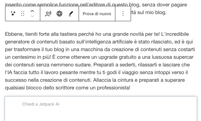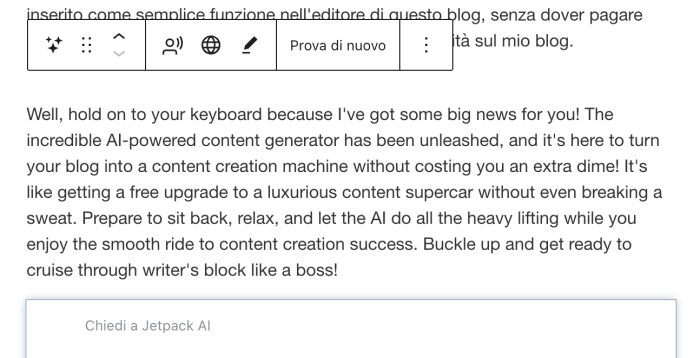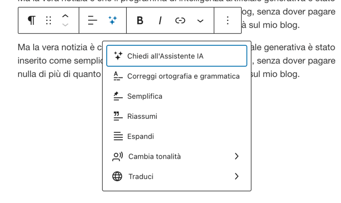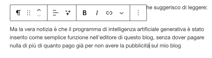 Ma la vera notizia in questo post è che il programma di intelligenza artificiale generativa è stato inserito come semplice plug in nell’editor di questo blog con una icona che riproduce magiche stelline, senza dover pagare nulla di più di quanto pago già per non avere la pubblicità sul mio blog.