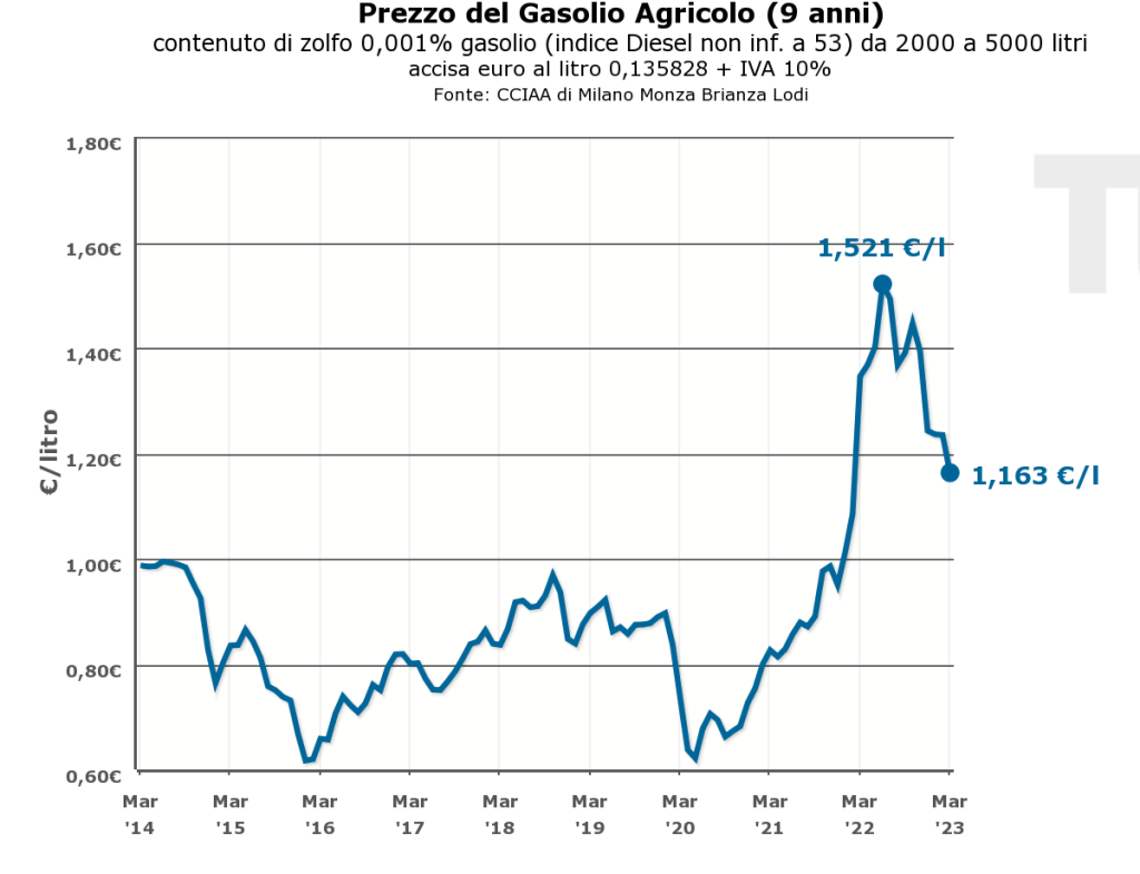 Ma i trattori come sono alimentati? a Gasolio agricolo uno speciale carburante colorato di rosso, ma equivalente a quello per autotrazione utilizzato dai diesel, che gode di esenzioni fiscali tali da costare significativamente di meno. Le quantità disponibili per ogni azienda sono contingentate e calcolate in base alle dimensioni delle imprese agricole e alle attività che in essa sono previste. Come si vede dal grafico il prezzo del carburante ha subìto gli stessi aumenti che abbiamo avuto noi automobilisti durante la crisi energetica dovuta alle sanzioni per la guerra ucraina.